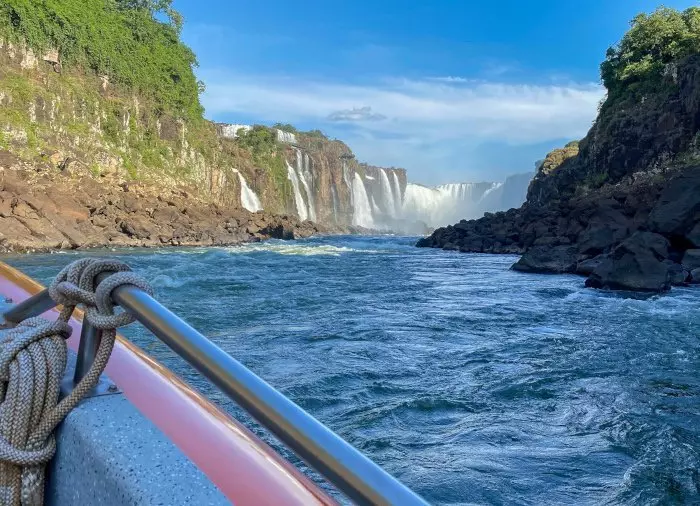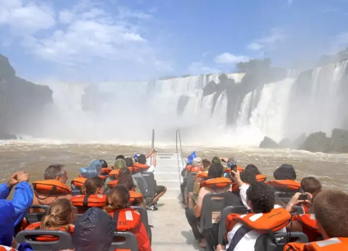 Du får set de gigantiske vandfald nedefra, og som afslutning sejles der hen under et af de mindre vandfald, så du kan få lov at prale med, at du har taget et brusebad i Iguazú-vandfaldene! Det er selvfølgelig helt frivilligt, om du har lyst til ligefrem at stille dig midt i vandkaskaderne. Uanset hvad, bliver du helt sikkert gennemblødt på turen, så det er en god ide at skifte til enten badetøj eller iføre dig en regnponcho. Du får udleveret en vandtæt taske til dine værdigenstande.