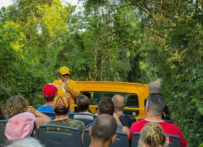Første del af turen går med 4WD bus igennem junglen ad en 5 km grusvej ned til havnen. Herfra går en stejl trappe ned til havnen, hvor en speedbåd venter på at tage dig med op ad floden mod de larmende og brusende vandfald.