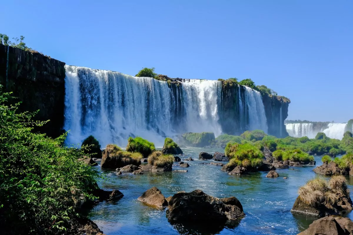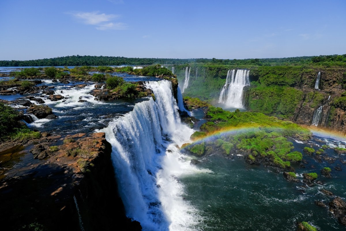 Iguazú-vandfaldene er verdens største og består af 275 mindre og større vandfald langs en 2,7 km lang strækning på Iguazú-floden. Vandfaldene løber ofte sammen og vælter i støjende kaskader udover de op til 85 meter høje klipper, som er formet som en hestesko.
