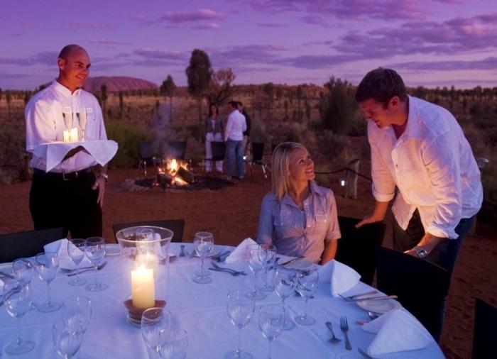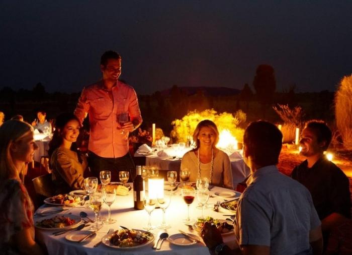 Nyd en middag under stjernerne på den prisvindende Sounds of Silence Restaurant. Midt i den australske ørken bliver du budt velkommen med et glas bobler. Lyden fra en didgeridoo lyder i baggrunden, mens solen langsomt går ned over Uluru. Når mørket er faldet på, byder værterne på lækker australsk BBQ med mulighed for at smage spændende australske specialiteter. Middagen serveres som buffet og der spises ved store borde med ca. 10 gæster ved hvert bord. Bagefter fortæller en astronom om den mægtige stjernehimmel over dig.