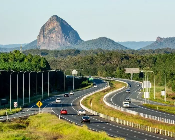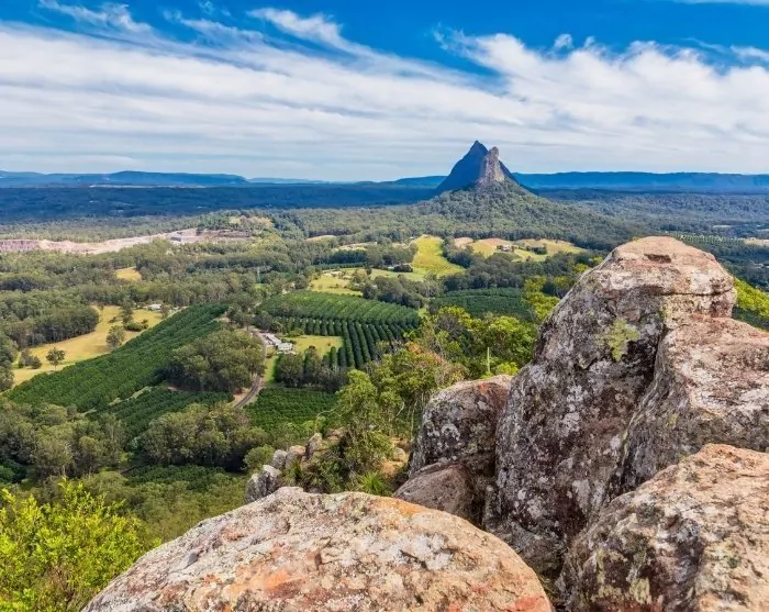 Ca. en times kørsel nord for Brisbane ligger det naturskønne område Glass House Mountains. Det er gruppe af naturskabte klippeformationer, som stiger brat op fra det omkringliggende flade landskab og danner en spektakulær kulisse, der er synlig fra lang afstand. Der er vandreruter med varierende sværhedsgrader, så både nybegyndere og erfarne vandrere kan finde noget, der passer til deres niveau. Men du kan også blot køre forbi og tage nogle flotte billeder.