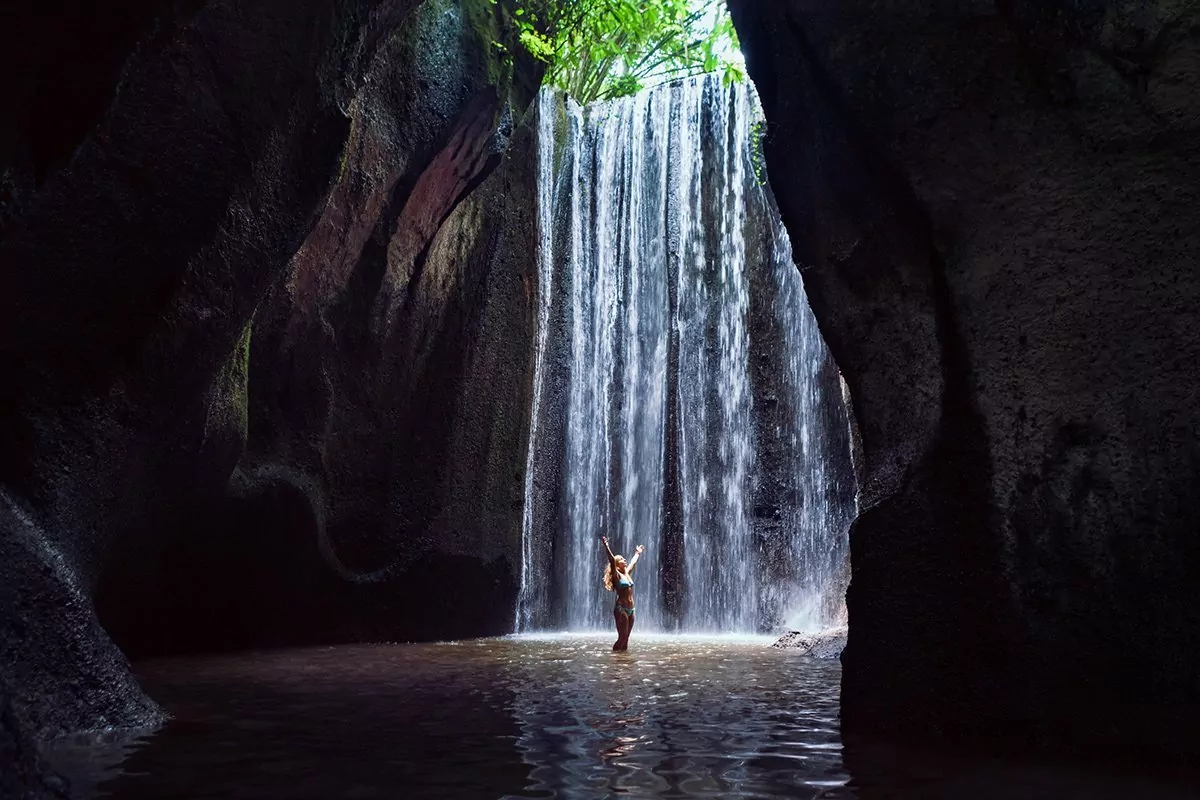 Sidste besøg er det fascinerende og fotogene vandfald, Tukad Cepung, der ligger som en skjult juvel i junglen øst for Kehen-templet. Fra parkeringspladsen fører trapper ned til junglen og efter ca. 20 minutter er du nede. Her følger du en sti langs et vandløb og undervejs kan du betragte de frodige omgivelser. Vær opmærksom på at du går i vand det sidste stykke vej ind til selve vandfaldet, så husk gode sko der kan tåle at blive våde! Synet af Tukad Cepung kan få enhver til at miste pusten. Vandfaldet falder 15 meter ned mellem imponerende klippeformationer og hvis vejret er med dig, kan du se solens stråler skinne ned i grotten og skabe det perfekte billede.