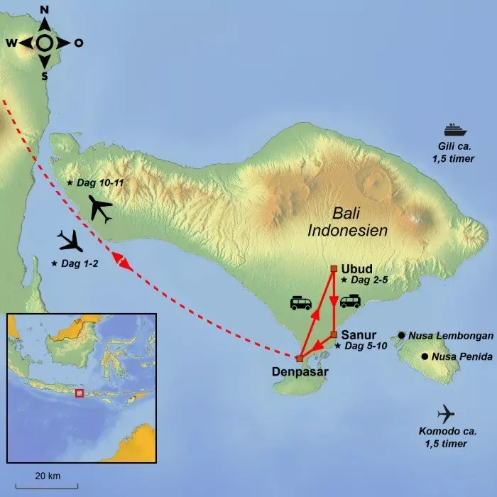 Rejsen starter i den charmerende og fortryllende kunstnerby Ubud, der ligger smukt i Balis højland omgivet af græsgrønne rismarker, floder og hellige templer. Ubud er også Balis kulturelle hjerte, hvor ceremonielle optog og traditioner dyrkes med sjæl. Dagene er til fri disposition, hvor du kan vælge og vrage mellem en række spændende tilkøbsture.