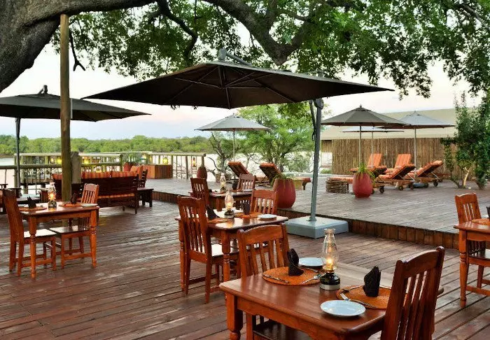 Lodgen har to restauranter, spa og to barer, hvoraf den ene er perfekt til en ”sundowner” med udsigt til floden og solen, der går ned over nationalparken.