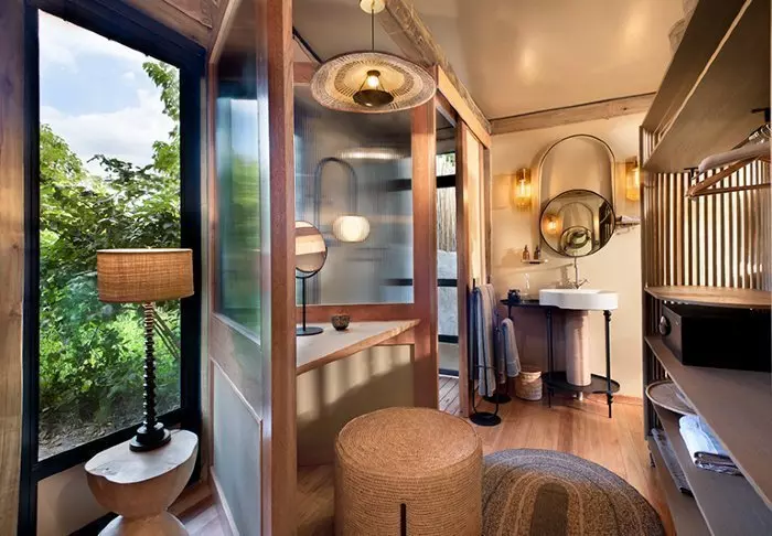 Der er ingen permanente konstruktioner i campen, hvilket er med til at give følelsen af virkelig at være midt naturen, men inde i dit telt føles det som luksus. Midt i teltet står den bløde seng, og du har dit eget badeværelse med rindende vand og indendørs og udendørs bruser. Alle telte er rejst på platforme, og fra de charmerende verandaer er der en flot udsigt over området.