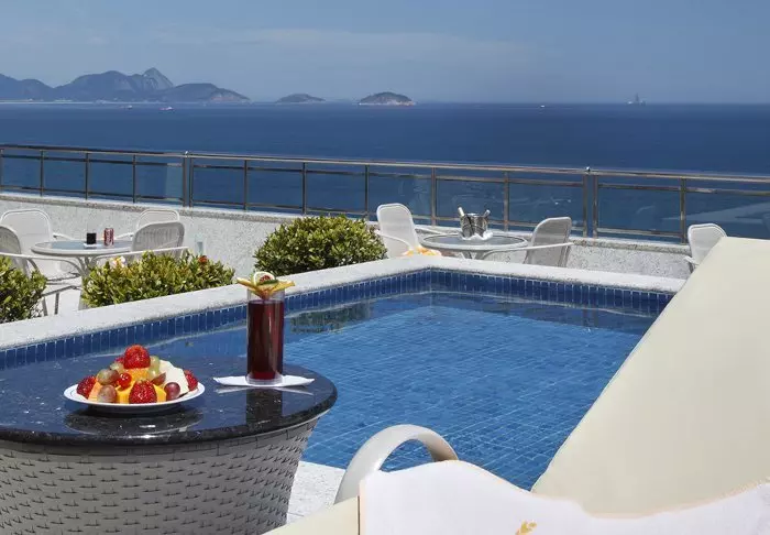 Fra hotellets tagterrasse har du en formidabel udsigt ned over den livlige Copabana-strand og ud over havet. Heroppe finder du også fitnessrum, sauna, bar samt en lille swimmingpool, der indbyder til en forfriskende dukkert.