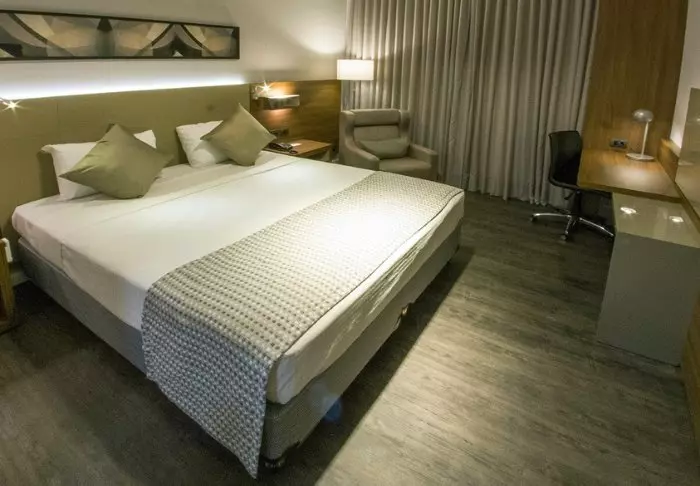 Alle værelser er moderne indrettet i rolige farver og har aircondition, minibar, værdiboks, tv, wi-fi og badeværelse med toiletartikler.