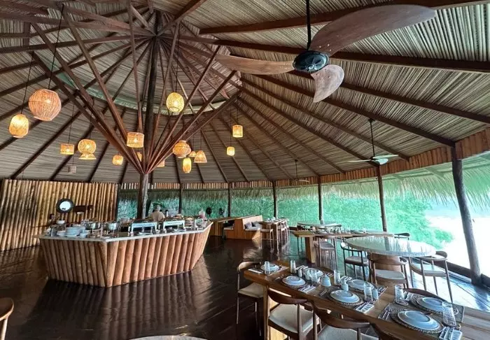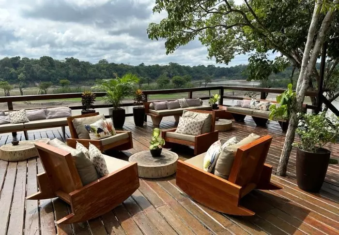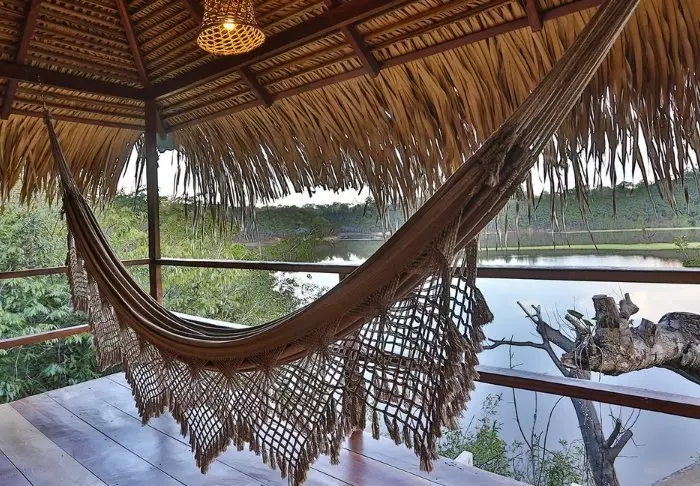 I en fælles bungalow med hængekøjer kan du slappe af efter junglens oplevelser og nyde en drink fra lobbyens bar. Her findes også et udvalg af bøger og brætspil til fri afbenyttelse.