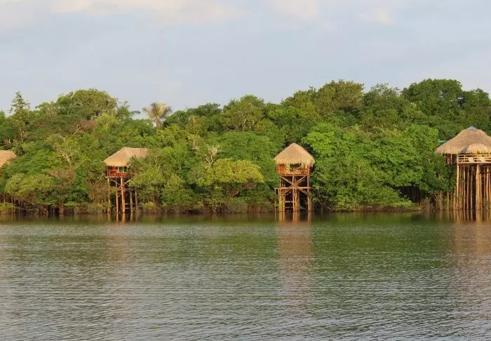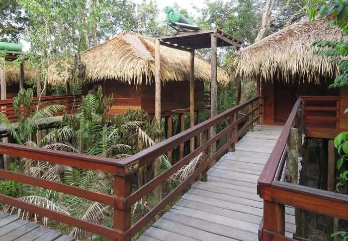 De unikke bungalows er bygget på op til 15 meter høje pæle, for at tilsikre at de ikke bliver oversvømmet i regntiden, hvor vandstanden stiger kraftigt.