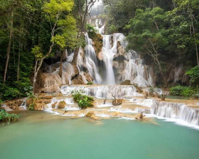 Lidt uden for Luang Prabang kan du besøge det smukke Kuang Si-Vandfald, hvor det er muligt at bade i de naturlige pools, eller besøge centret for Malajbjørne.