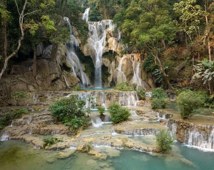 Efter en dejlig frokost venter en køretur på 30 km syd for Luang Prabang til Kuang-Si-vandfaldet. Her lokker et forfriskende bad måske? Omgivet af frodig, tropisk jungle strømmer Kuang Si-vandfaldet i kaskader over 3 niveauer ned ad en stejl bakkeside. Det længste fald er på 60 meter og på det laveste niveau, kan du køle dig i de rolige pools’ turkisblå vand.