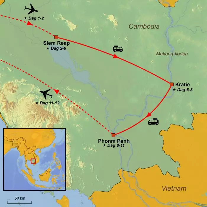 Oplev verdensklasseattraktionen Angkor Wat, de frodige landskaber langs Mekongfloden, de sjældne Mekong delfiner i Kratie og den sprudlende hovedstad Phnom Penh. Forlæng rejsen med badeferie.