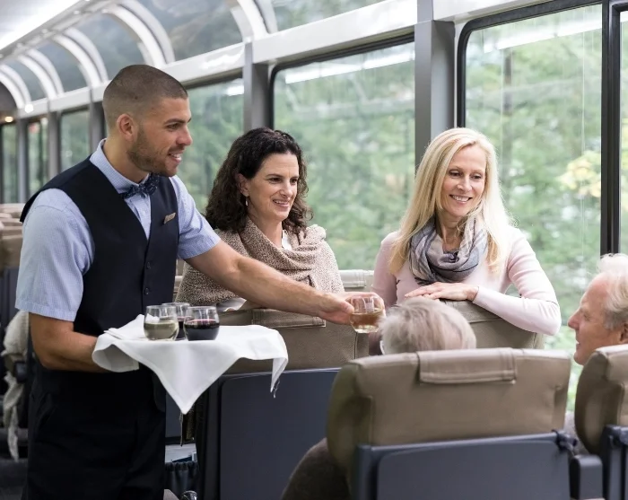 Togets delikate morgenmad og frokost nydes alt imens Rocky Mountains’ dramatiske landskab udfolder sig foran dig på den anden side af togets store vinduer – de såkaldte glasdomer – aldrig har kaffe smagt bedre.
