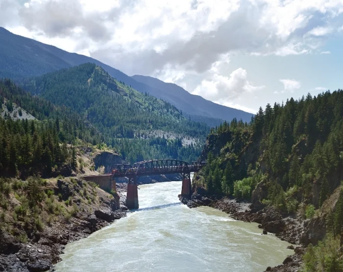 Rejsen fortsætter videre forbi den imponerede jernbanekonstruktion ved Cisco Crossing, hvor du kan se to jernbanebroer krydse hen over hinanden med Fraser River under sig.