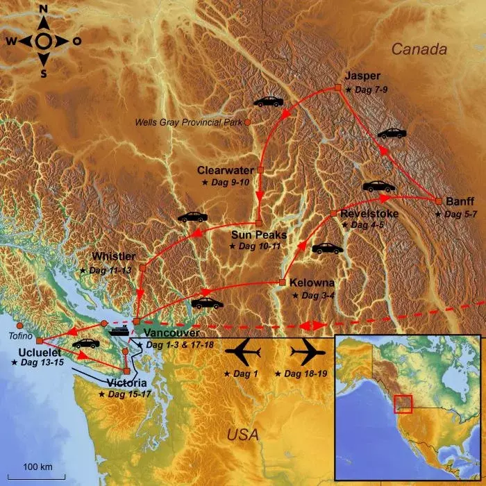 *Vær opmærksom på, at du i dag forlader Alberta til fordel for provinsen British Columbia. Du bevæger dig samtidig ind i en anden tidszone: British Columbia er én time bag Alberta.