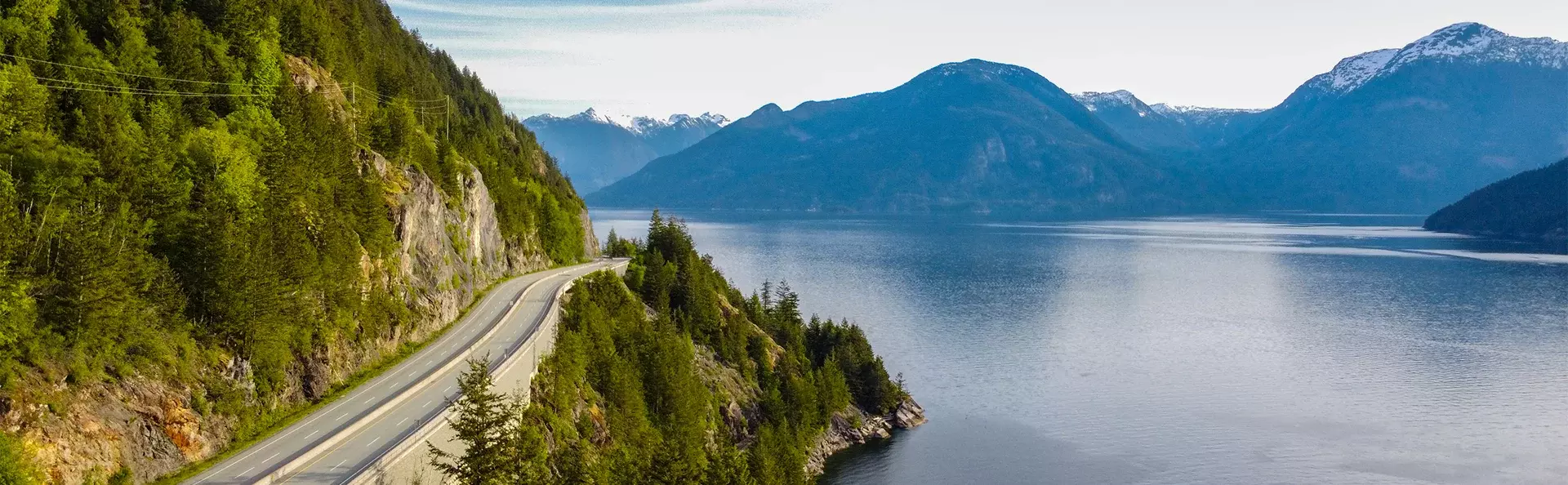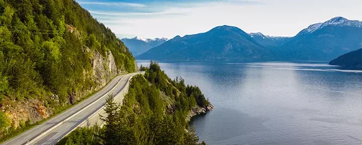 Selvom du på nuværende tidspunkt allerede har kørt på adskillige ikoniske veje, så er dagens rute på knap 1,5 time ingen undtagelse. Fra Whistler kører du på Highway 99 – bedst kendt som ”Sea to Sky Highway”. Som navnet antyder, får du nemlig kontrasten mellem hav og himmelhøjderne at opleve i dag. Fra Whistlers bjerge til dybe fjorde.