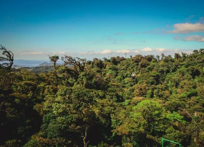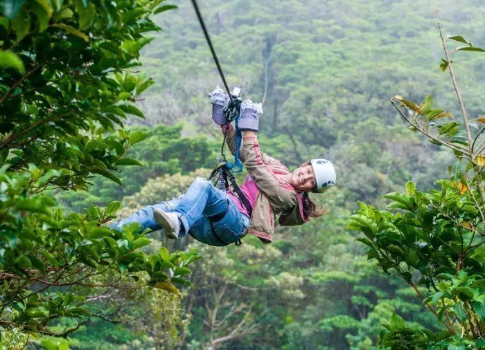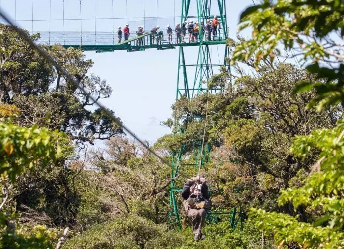 Du suser hen over tågeregnskovens kløfter og frodige vegetation og måske endda igennem skyerne ad kabler, der er solidt fastspændt til platforme i træernes toppe. Du når hastigheder på op til 70 km/t på de 8 forskellige kabler, hvor det længste er 750 meter langt, og det højeste er 100 meter over jorden.