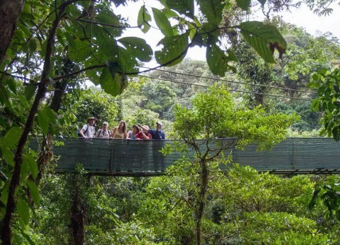 Først venter dig en spændende vandretur på ca. 2,5 kilometer i den eventyrlige tågeregnskovs trætoppe. Du går på hængebroer mellem træerne, hvorfra du vil kunne mærke den helt særlige og mystiske stemning, som tågen giver dette fortryllende landskab. Her er du omgivet af enorme træer, orkidéer, bregner, mos og lyden fra kvidrende farverige fugle som quetzal-fuglen og den lille vakse kolibri ved navn kobberisset smaragd. Med mere end 400 andre fuglearter er skoven et sandt paradis for fugleentusiaster.
