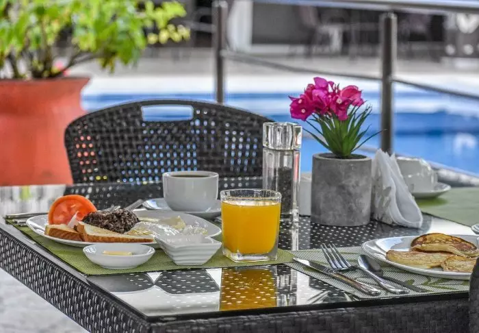 Din inkluderede morgenmad serveres i hotellets lille restaurant, som også har åbent til frokost og aftensmad (undtagen maj og juni måned – hvor restauranten kun har åbent til morgenmad).