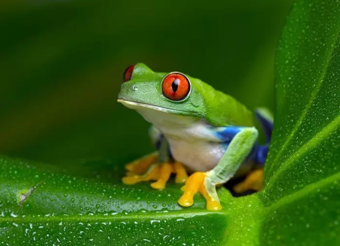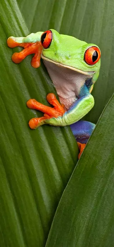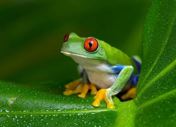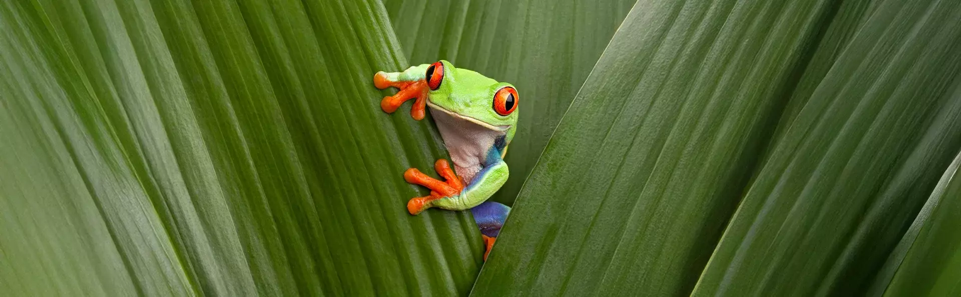 Rødøjet løvfrø gemmer sig i grønne blade i regnskov, Costa Rica