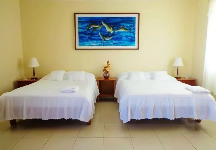 Her er blot 16 værelser (4 standard værelser og 12 standard værelser med havudsigt). Værelserne er simpelt indrettede, men pæne og rene med farverige billeder på væggene af naturen og dyrelivet på Galapagos-øerne. Alle værelser har eget badeværelse, aircondition, wi-fi og kabel-tv.