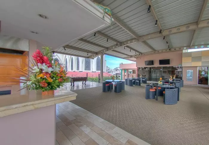 Efter en spændende dag i Quito kan du slappe af i hotellets lille loungeområde eller på den udendørs terrasse, hvor du kan se solen gå ned bag bjergene.
