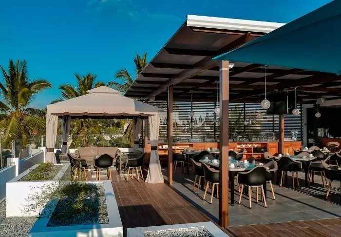 Hotellets restaurant, La Terraza, er beliggende på hotellets tagetage, med en skøn udsigt ned til den hyggelige havn og den omkringliggende natur. Her nydes din inkluderede morgenmad i den friske morgenbrise. På udvalgte dage er det også muligt at spise aftensmad heroppe.