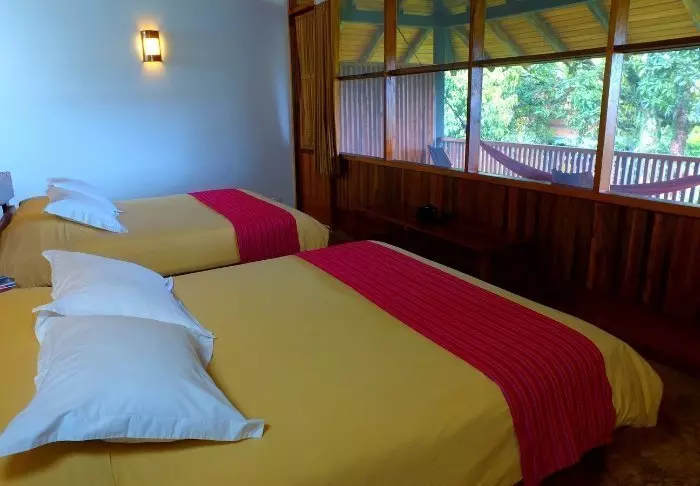 Lodgen har 76 rummelige rustikke værelser, som alle har vifte, privat badeværelse og egen terrasse med en hængekøje, hvor du kan slappe af og nyde de frodige omgivelser. Der er blot myggenet for vinduerne, så du får en naturlig brise i værelset, og samtidig kan du ligge og lytte til junglens lyde og den brusende flod. Om natten vil vi dog anbefale at bruge ørepropper, da regnskovens lyde godt kan larme mere, end du måske regner med.