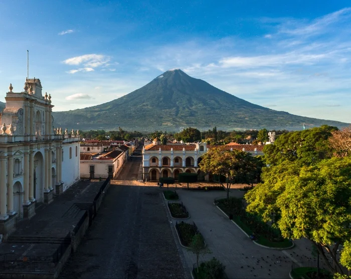 Udover sin smukke arkitektur og hyggelige atmosfære, er Antigua Guatemala berømt for sin enestående beliggenhed. Byen er nemlig placeret mellem tre enorme vulkaner (Volcán de Agua, Volcán de Fuego og Volcán Acatenango), som kan beundres fra bymidten eller på udsigtspunkter som Cerro de la Cruz.