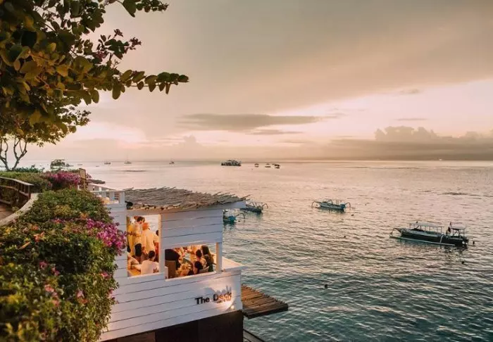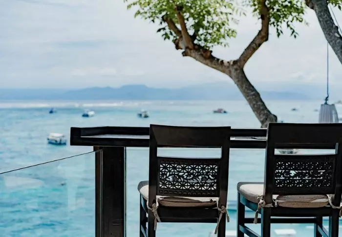 Batu Karang Lembongan Resort ligger på en koralskråning over Jungut Batu-stranden med udsigt til Badung-strædet og den storslåede vulkan Mt. Agung på Bali.