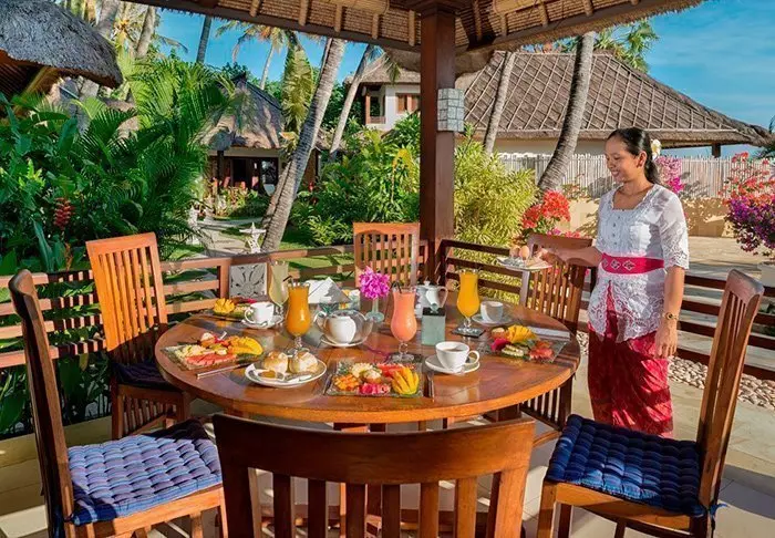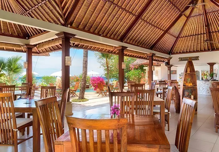 I restauranten står et køkkenhold af lokale, fra den nærliggende landsby, klar til at servere balinesiske og indonesiske retter lavet af lokale råvarer og friske fisk leveret af de lokale fiskere. Her er samtidig en dejlig brise fra havet og en smuk udsigt til stranden.