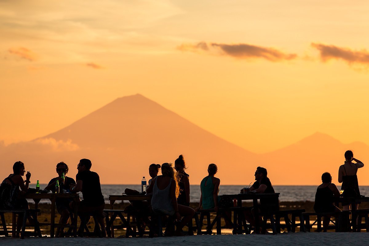 Om dagen er atmosfæren afslappet og om aftenen er der stemning og glade dage ved de mange små restauranter og barer. På vestsiden af øen kan du nyde de smukke solnedgange over Bali, og hvis du er heldig og vejret er klart, vil du endda kunne se solen gå ned bag vulkanen Mt. Agung.