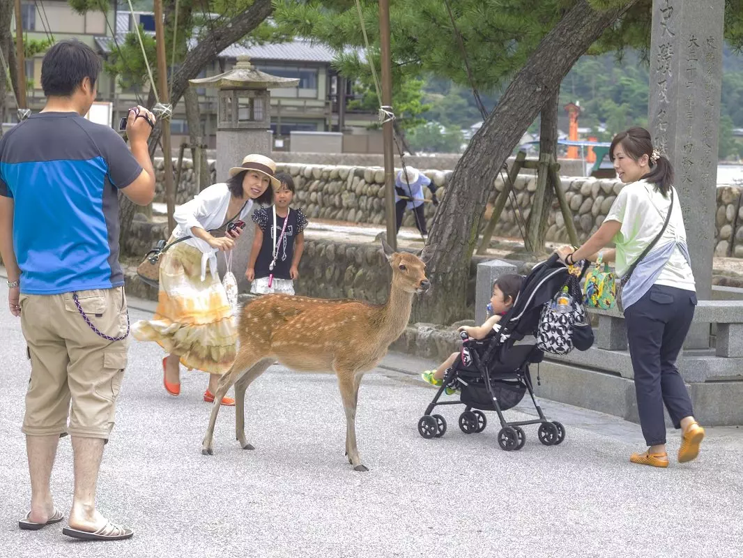 Vi foreslår en dagstur til Miyajima. Miyajima ligger mindre end en times transport fra Hiroshima, og det er let at komme dertil med offentlig transport. Det er her, du finder den knap 20 meter høje verdensberømte orangerøde port, der ligger ude i vandet, og ved højvande ser ud som om, den flyder på vandet. Når du ankommer med færgen til øen, hvis egentlige navn er Itsukushima, passerer du gennem nogle turistgader med souvenirbutikker, små gavedelikatesseforretninger og caféer, inden du når frem til stedet, hvor du kan se den enorme port. Undervejs vil du sikkert møde de tamme sikahjorte. På øen ligger Daisho-in, et buddhistisk tempel, som er åben for besøgende. Et pudsigt islæt her er, at buddhafigurerne ofte har halstørklæde og hue på. Du kan også tage kabelbanen til toppen af Misen bjerget, hvorfra der er en formidabel udsigt over Hiroshima og indlandshavet, hvor der ligger over 3000 småøer.