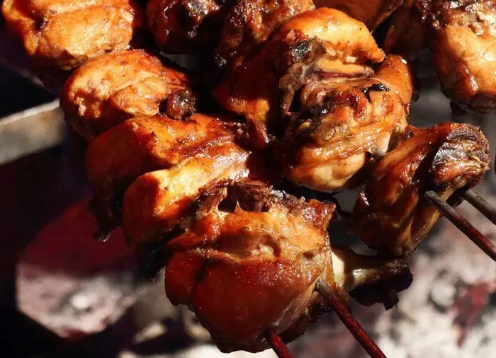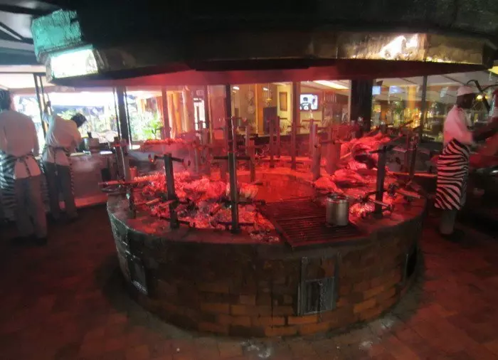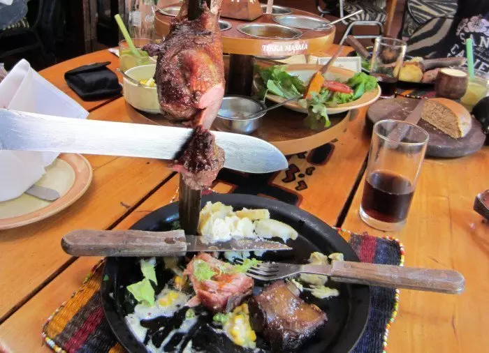 Kødet tilberedes på bedste maasai-vis over grillkul – og konceptet er ”spis alt, hvad du kan”, lige indtil du giver op og sænker det lille flag, du har ved dit bord.
