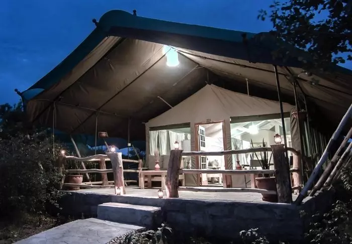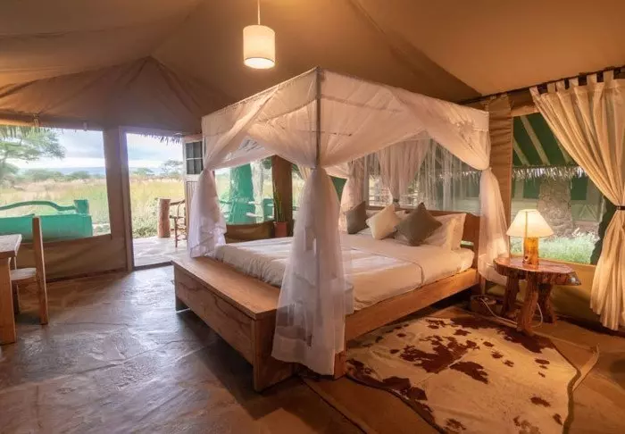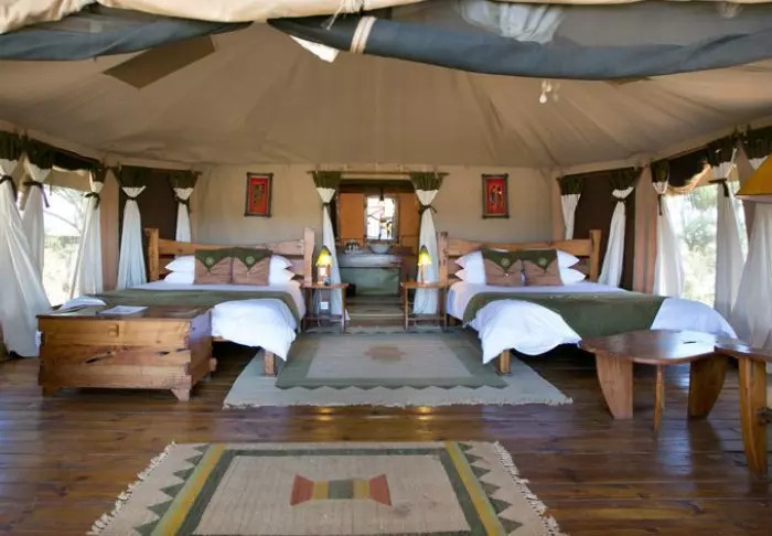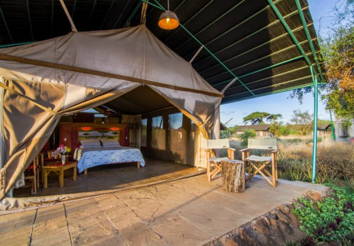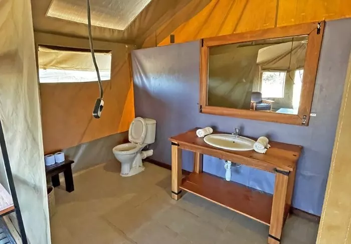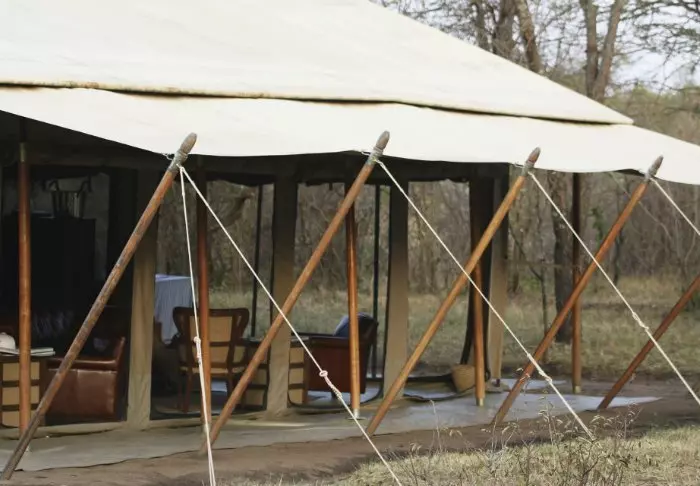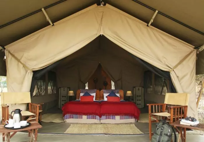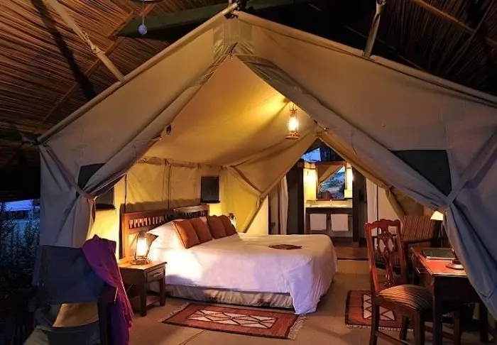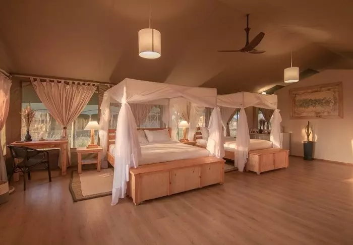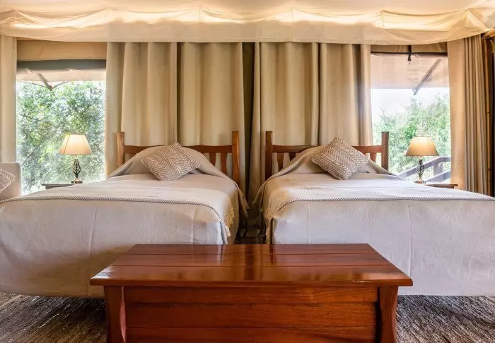 20 i alt – bestående af kanvas – som kan indrettes som single, dobbelt, triple, ja, sågar familietelt, hvis man rejser sammen som familie. De har alle fast gulv, eget badeværelse med varmt og koldt vand i bruseren, myggenet om sengene og store vinduer (bestående af myggenet, som man kan lukke til ved at rulle kanvas for), så du kan nyde den flotte udsigt til sletterne omkring dig. Hvert telt har en lille ”veranda” udenfor med stole og bord, hvorfra du kan nyde udsigten – og måske en god bog.