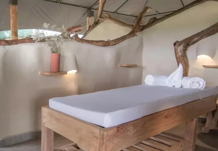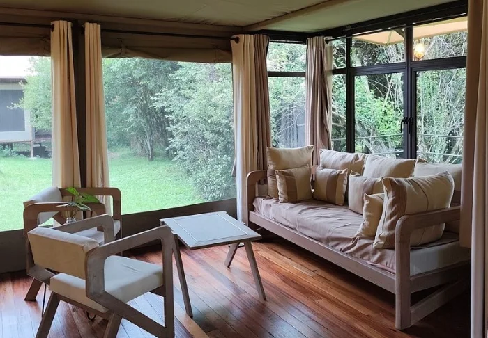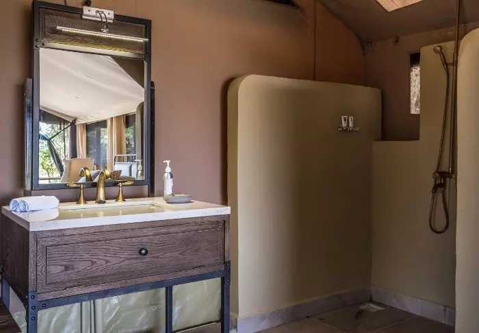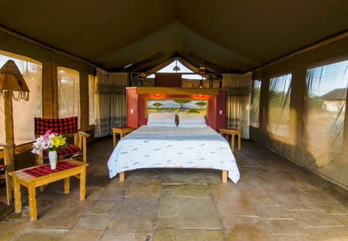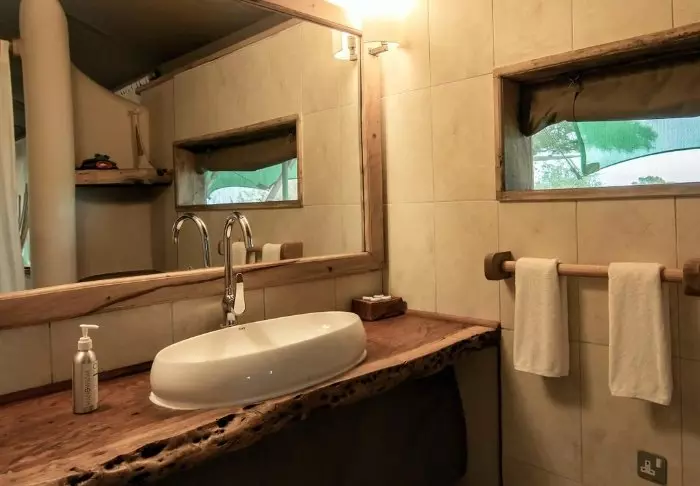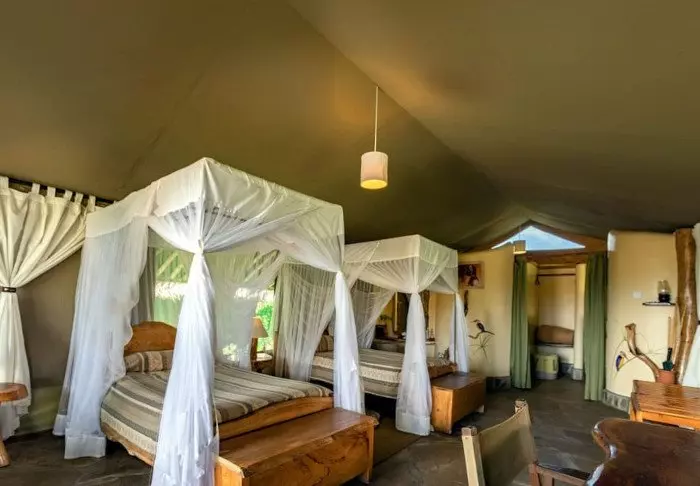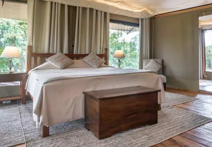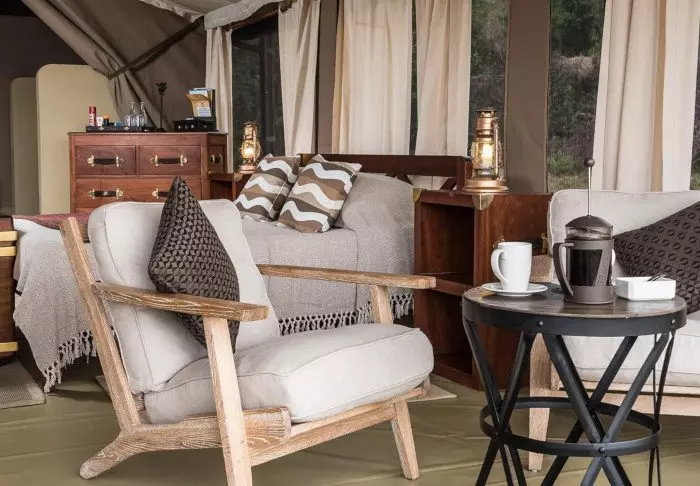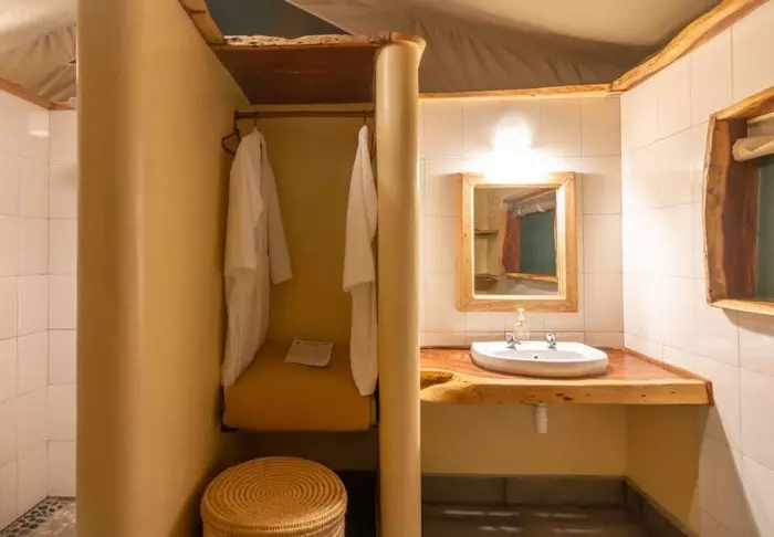 Teltene er store og velindrettet. Sengene har rigtige dyner og lækre bomuldslagner, og masaikulturen afspejler sig i udsmykningen med farverige sengetæpper og håndlavede møbler. Alle teltvægge består af kanvas – også badeværelserne. Men her er rigtigt toilet, rindende vand og bruser, så selvom du bor i telt og kan høre og dufte bushen udenfor, går du altså ikke på kompromis med komforten. Foran hvert telt har du din egen lille ”veranda” med safaristole og -borde og vi gætter på, at du nok kommer til at tilbringe en del timer her med bare at betragte naturen omkring dig.