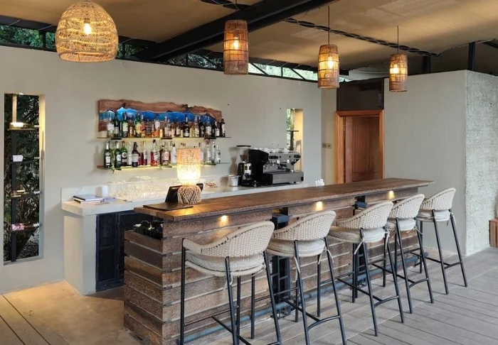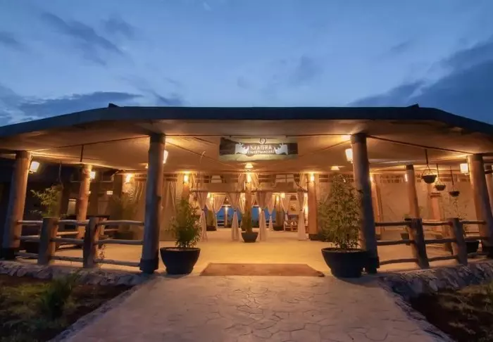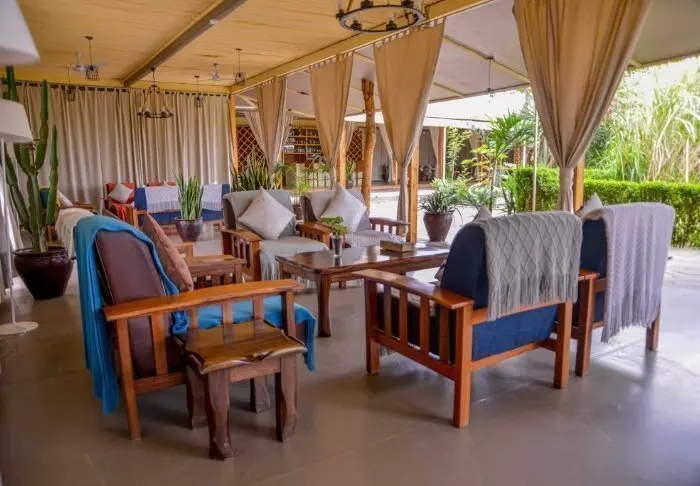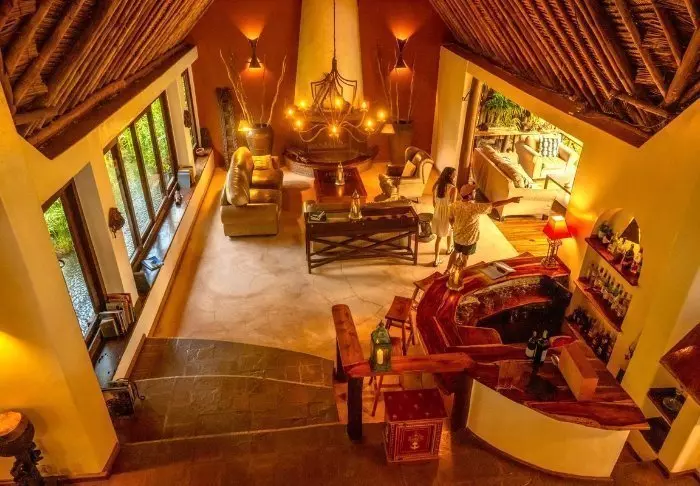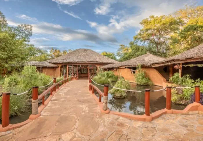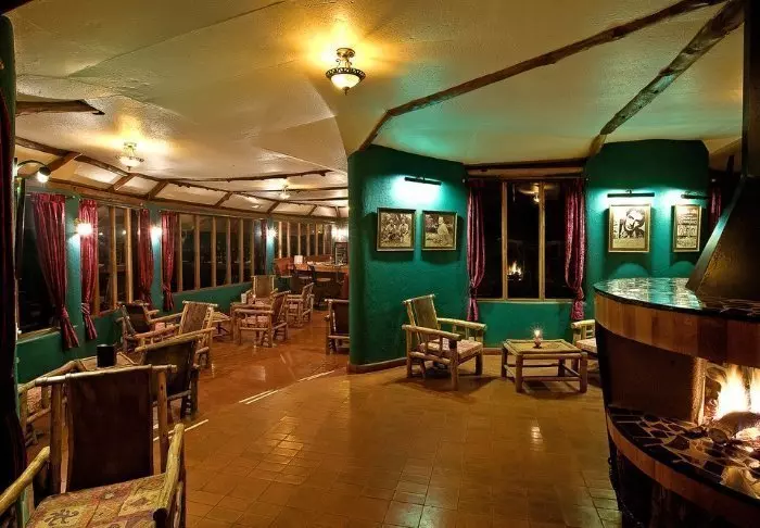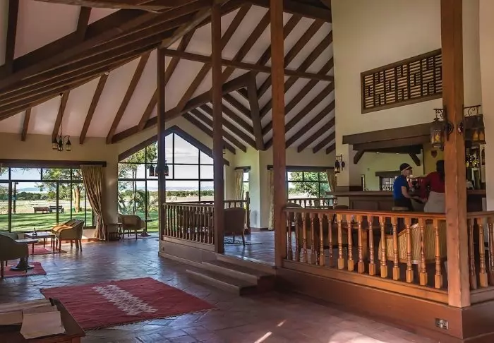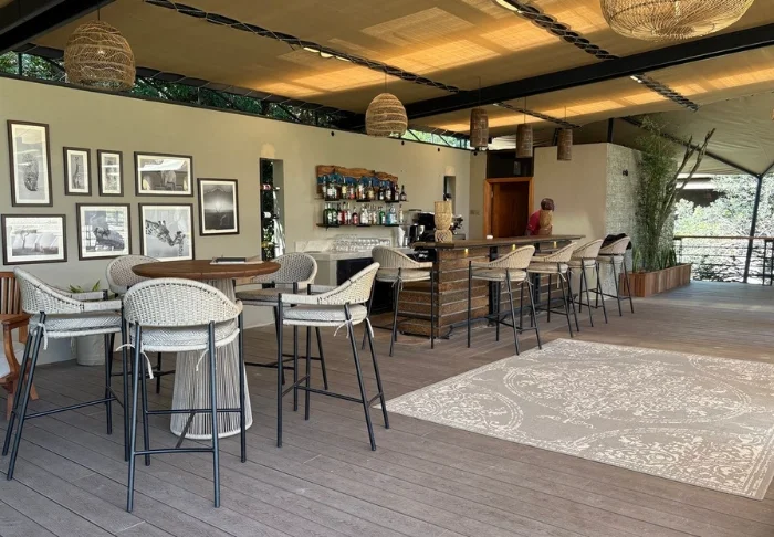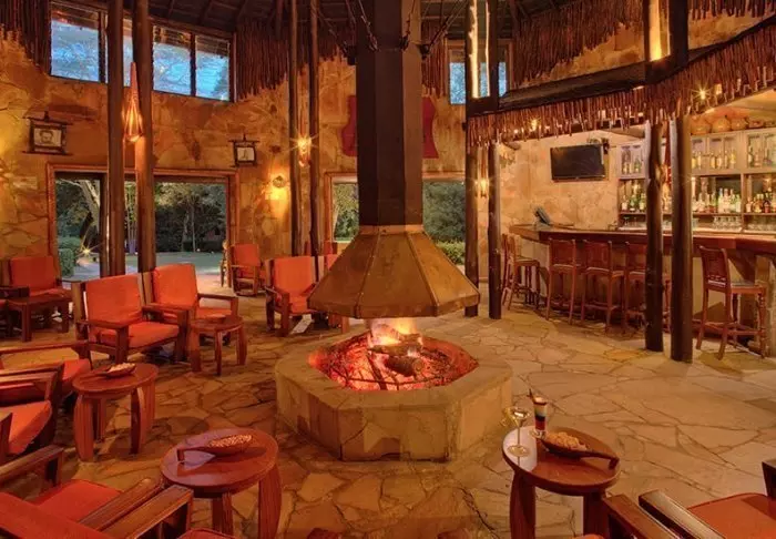 Lodgen har en central stråtækt spiseplads og en bar bygget i natursten. Spidsepladsen og baren er forbundet med en terrasse som har direkte udsigt ned til vandhullet.