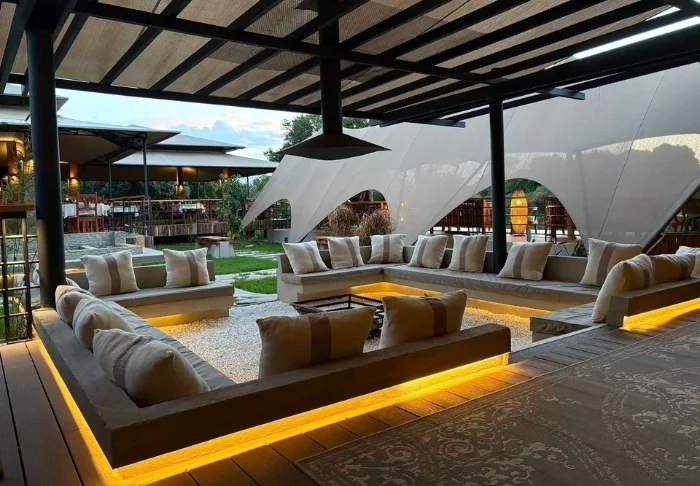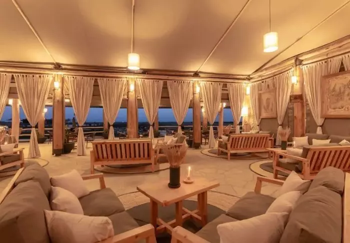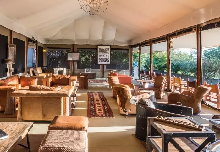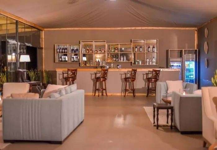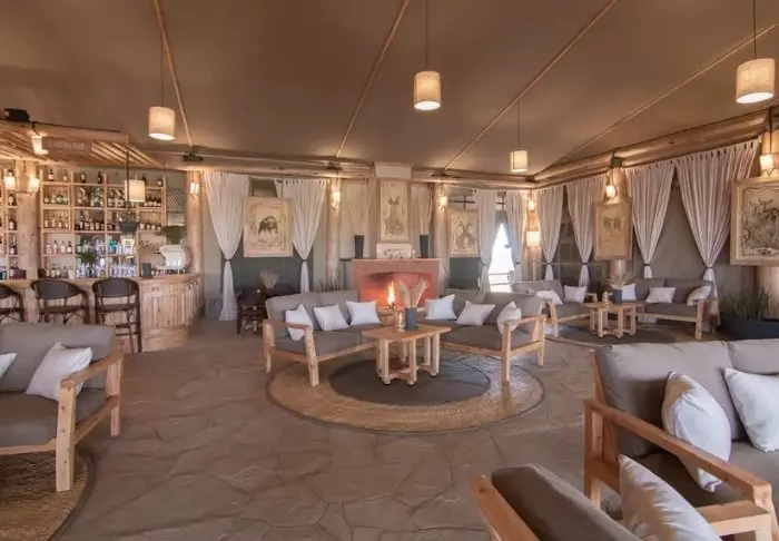 I lejren findes et fællestelt med lækre lædermøbler, hvor du kan slappe af efter middagen som enten serveres under åben himmel eller i restaurant-telt.