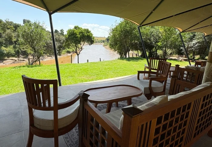 Straks ved ankomst føler du dig velkommen og det er svært ikke at blive imponeret over udsigten over sletterne på den anden side af floden. Indgangen til camp’en er designet, så blikket drages ned mod den murede bådplads med de flotte, farverige puder og videre over på fantastiske Masai Mara.