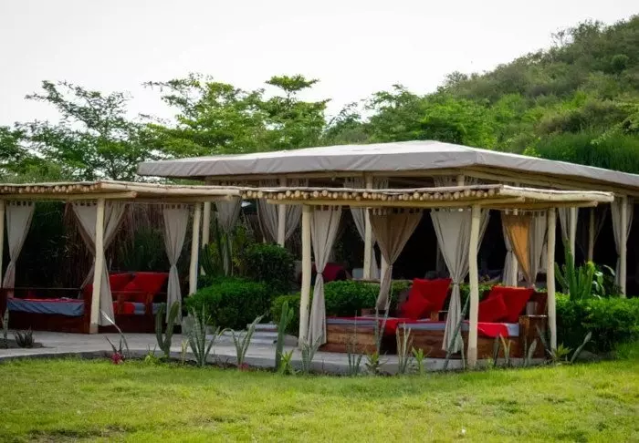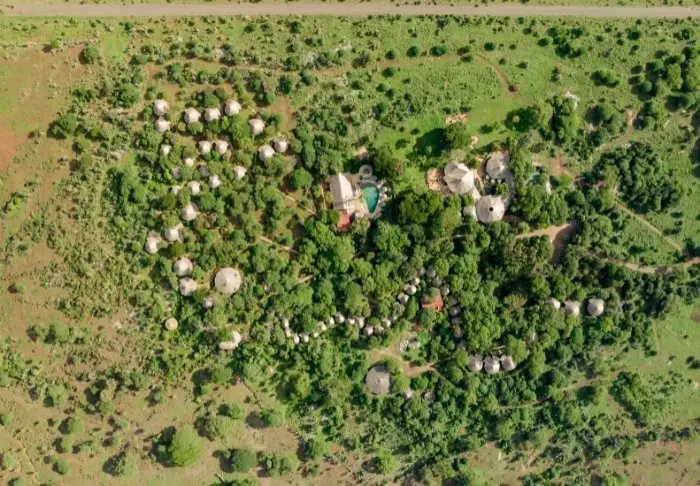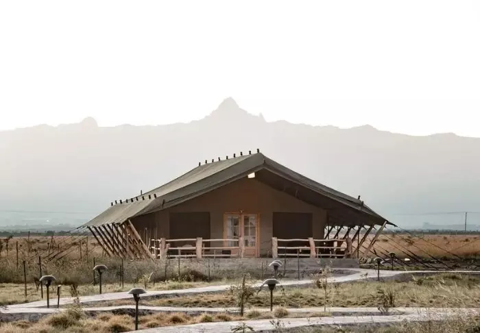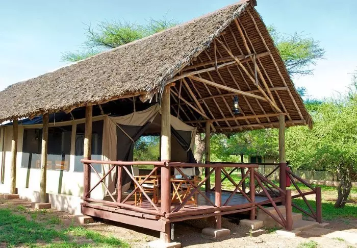 Teltene er bygget på cementplatforme, så de er hævet lidt fra jorden, og vægge og tag er af kanvas – dog er kanvastaget ekstra beskyttet af et karakteristisk afrikansk stråtag, som både skygger for sol og regn.