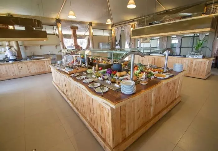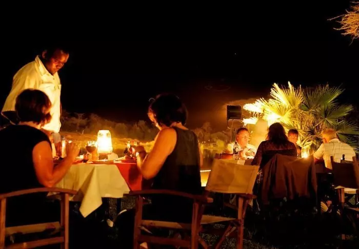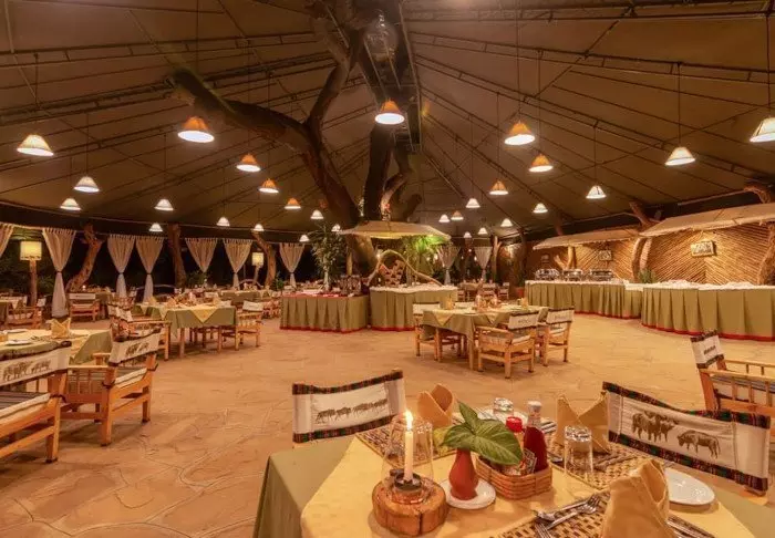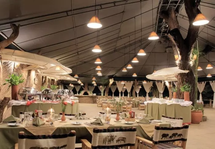 Måltiderne indtages i hovedbygningen, hvor du også finder receptionen samt den hyggelig bar. På udvalgte aftner er der endda til tider live musik i baren. Foran restauranten ligger en stor græsplæne med bænk og hyggekroge, hvorfra er udsigt til vandhullet og midtvejs mellem restaurant og teltene finder du poolen med solsenge omkring.
