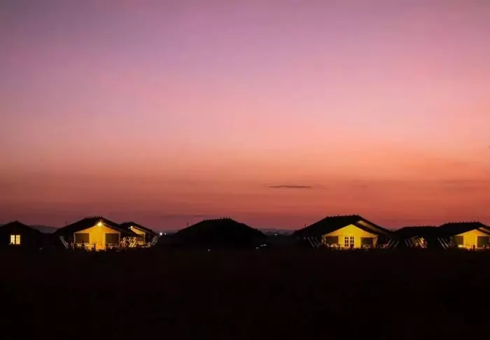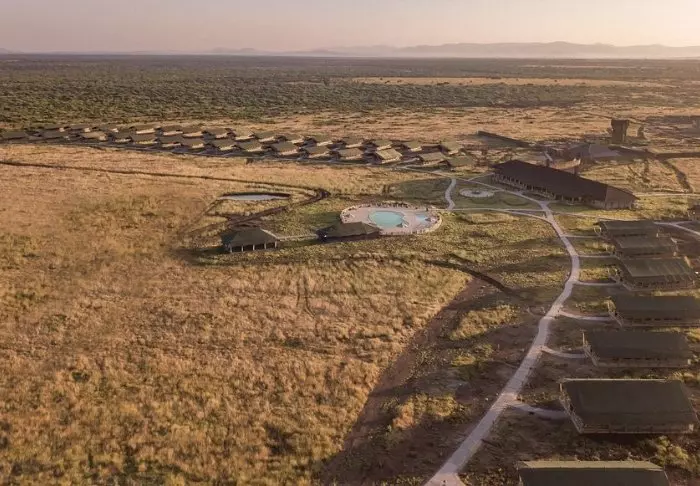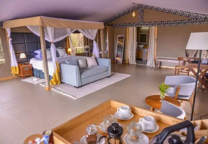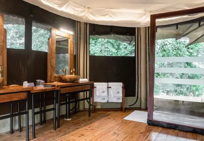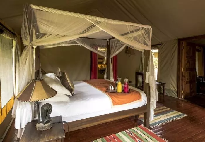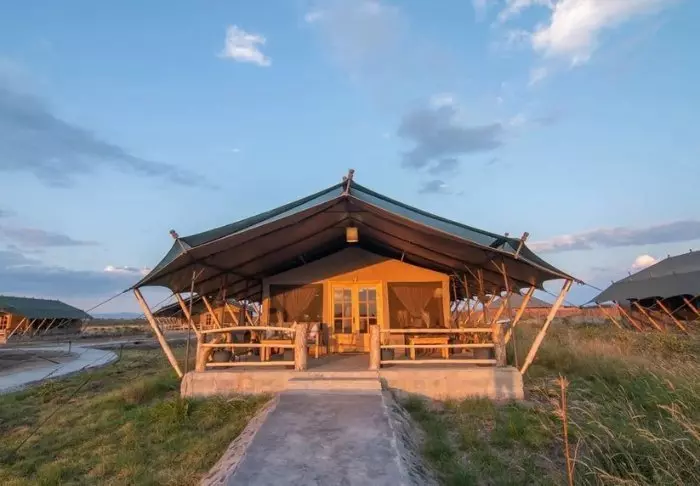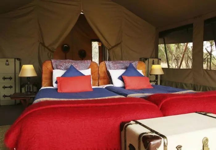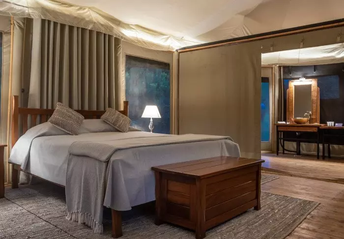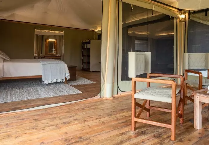 Her overnatter du i et af de 60 store og rummelige telte spredt ud over sletterne. Hvert telt har komfortable senge, et lille siddeområde, køleskab, te- og kaffefaciliteter samt deres egen lille veranda og privat badeværelse komplet med brusebad, håndvask og toilet.