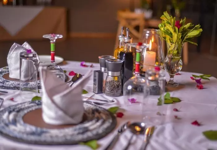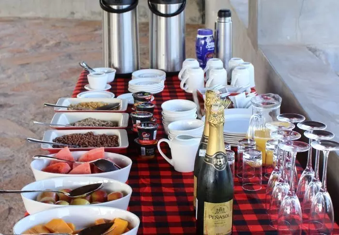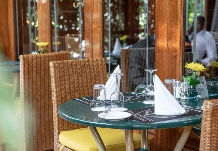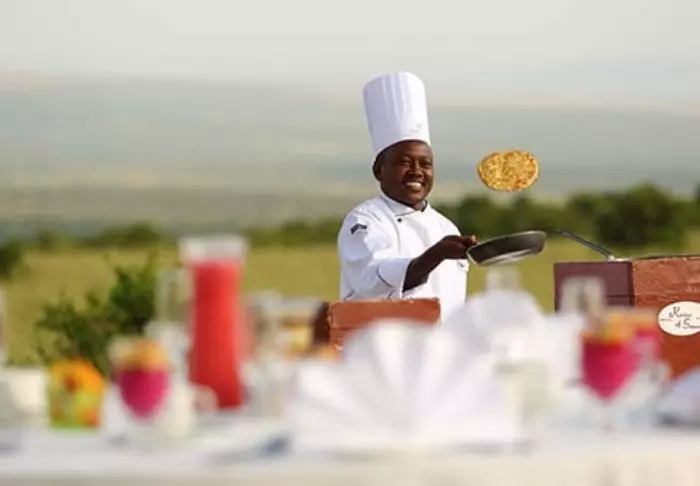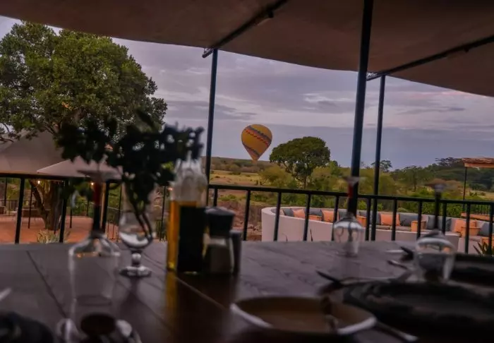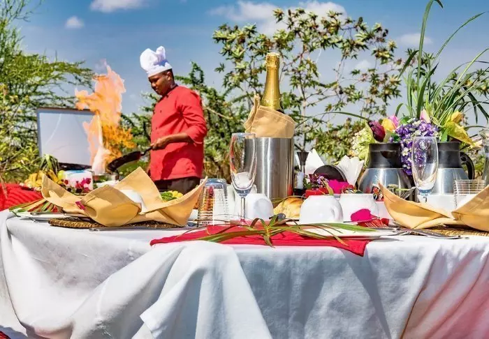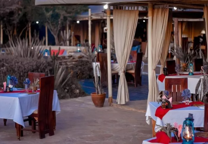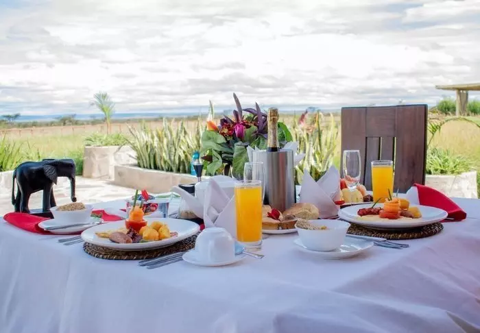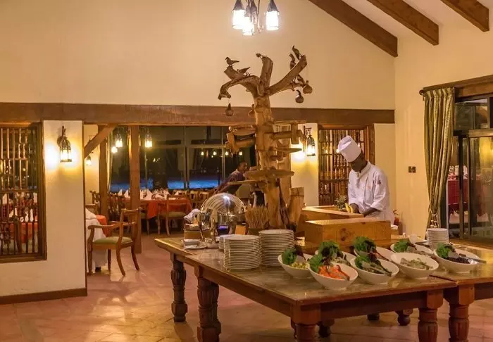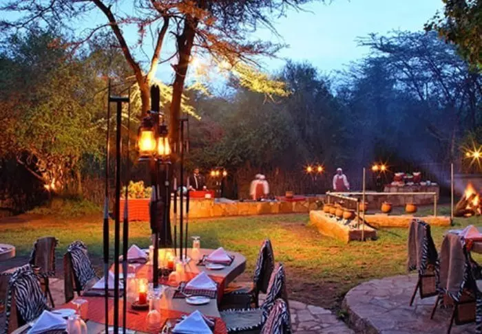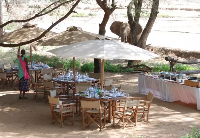 Hvor måltiderne indtages dikteres af vejret. På en klar, vindstille aften bliver det næsten ikke bedre end under åben himmel omkring poolen akkompagneret af lydene fra den afrikanske nat. Er vejret ikke helt til udendørs spisning, nydes måltiderne i restauranten. Det er typisk også her, morgenmaden serveres.