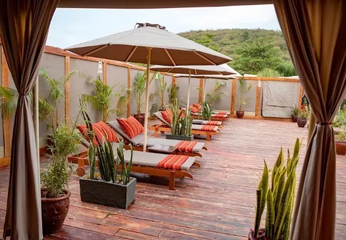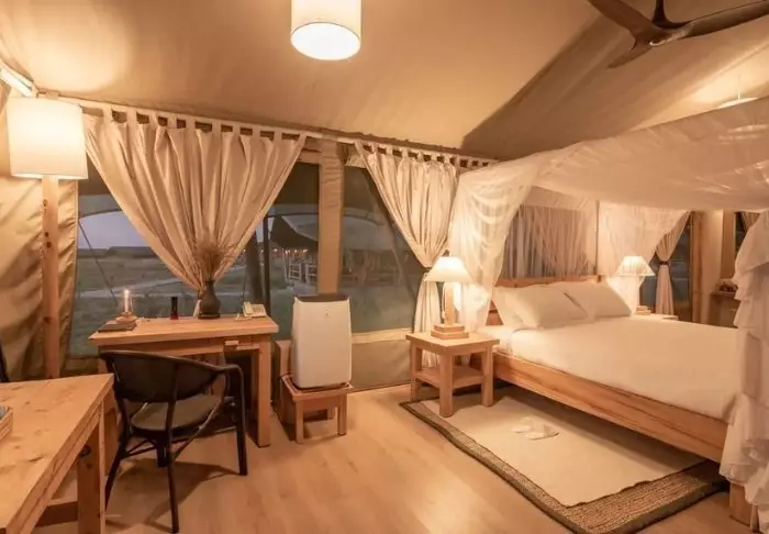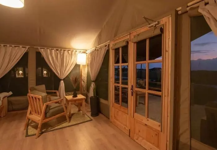 De 12 telte er indrettet efter alle kunstens regler med bløde senge, trægulve, lækre tæpper i flotte farver, god plads til både seng, bord og lænestole i teltene. Alle telte har naturligvis eget badeværelse med rindende (varmt og koldt) vand. Alle telte har egen terrasse, hvor der er en lille plunge pool, som kan køle dig ned på de varme dage.