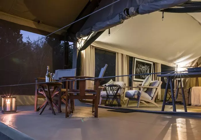 Alle teltene har vifte, drikkevandsbeholder samt myggenet omkring sengene. Her er masser af plads til bagagen samt en hyggelig læsekrog. På verandaen er der gode siddepladser, og det er nærliggende at tage et glas vin med fra baren og nyde solnedgangen over den afrikanske savanne herfra.
