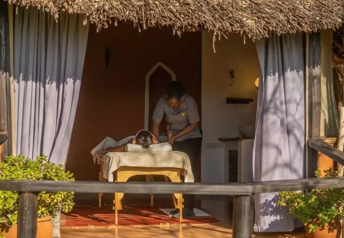 Også fra poolen er der en flot udsigt, og er kroppen mørbanket efter timerne i safaribilen, kan den lille spa byde på en god gang massage.