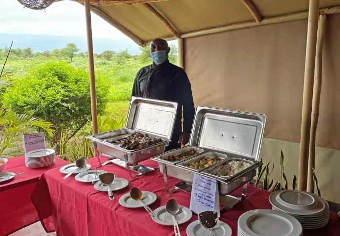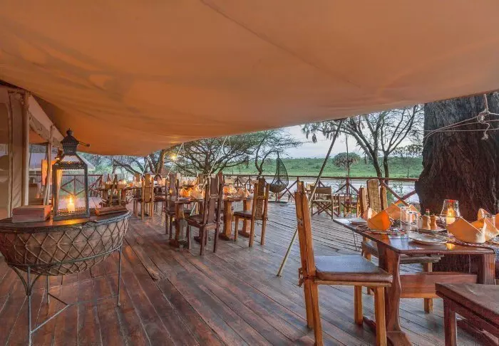 De 25 telte ligger alle i forlængelse af hinanden med restauranten som det naturlige midtpunkt. Det betyder, at der alle steder er en flot udsigt mod dammen med flodheste – og bjerget i nabolandet, Tanzania.