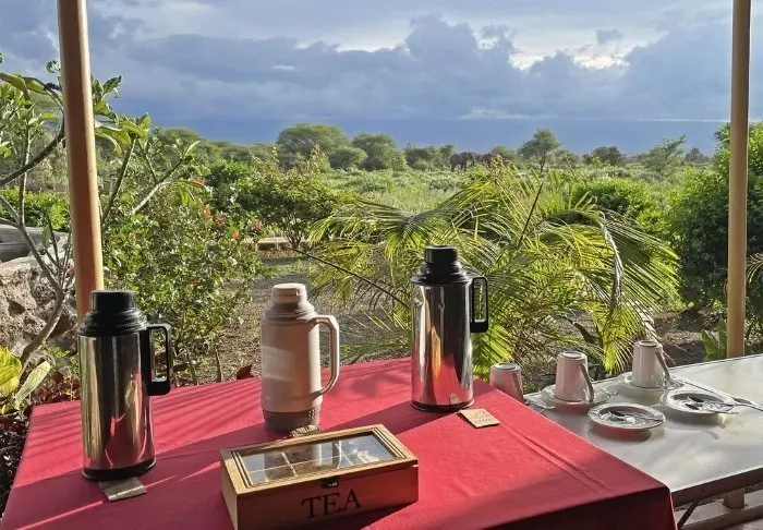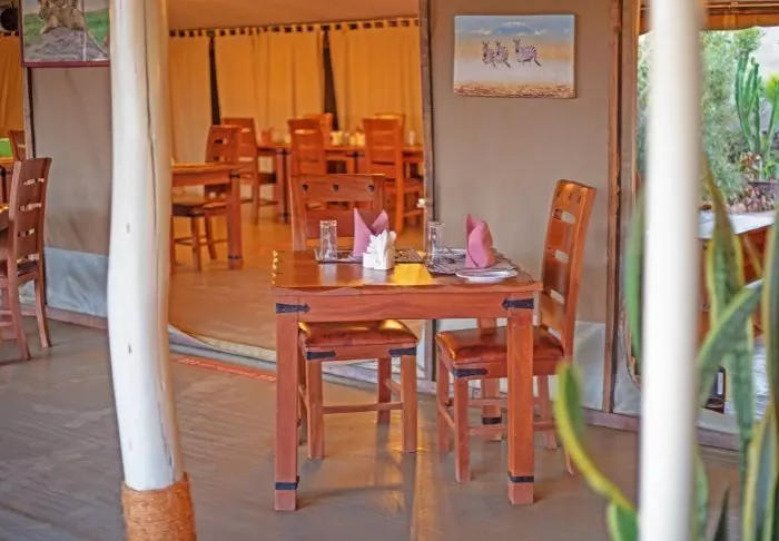 Måltiderne indtages i den delvis åbne restaurant med udsigt til Kilimanjaro.