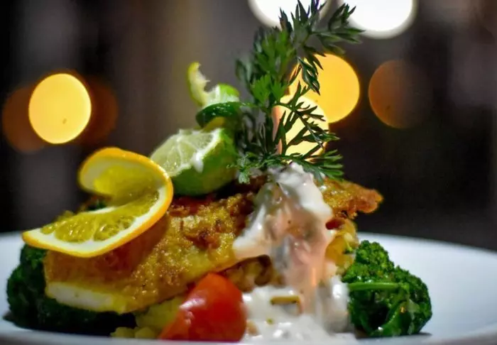 Måltiderne nydes i restauranten – en stor del af grøntsagerne dyrkes lokalt og retterne tilberedes fra bunden.
