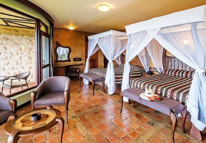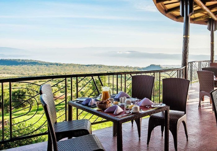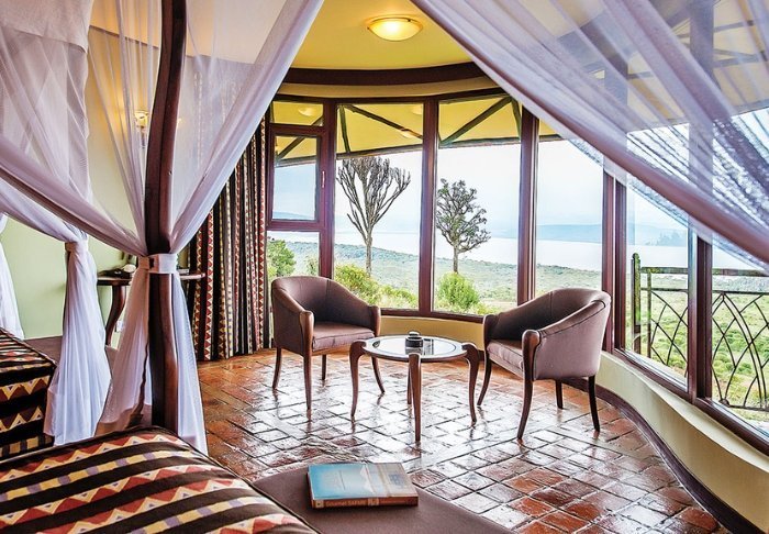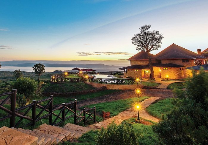 På skrænten af Great Rift Valley med udsigt over Lake Nakuru Nationalpark finder du den 4-stjernede Lake Nakuru Sopa Lodge. Om aftenen kan du skimte lysene fra byen Nakuru på den anden side – hvilket næsten gør mørket fra selve nationalparken endnu mørkere. Om dagen er der den flotteste udsigt over det frodige landskab, som udgør en af Kenyas fineste nationalparker.